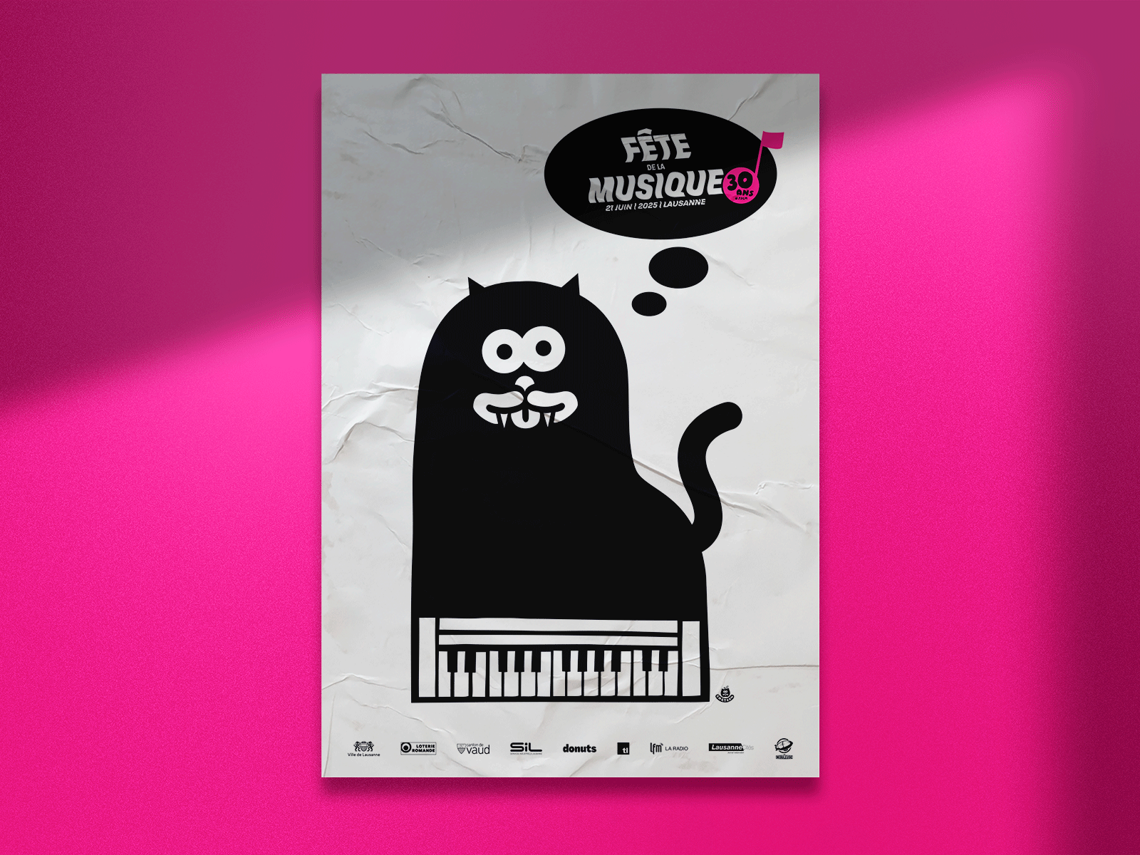 La Fête de la Musique de Lausanne a fêté ses 30 ans en 2025. Pour la quatrième année consécutive, Donuts Communication a accompagné l’organisation dans la création de son identité visuelle et digitale, de l’affiche officielle, co-signée avec l’artiste Chatcon, à la couverture en temps réel de l’événement.